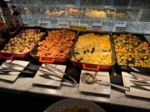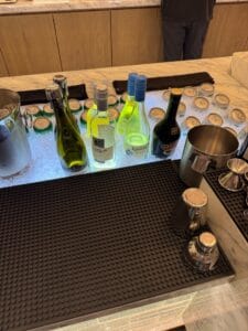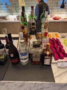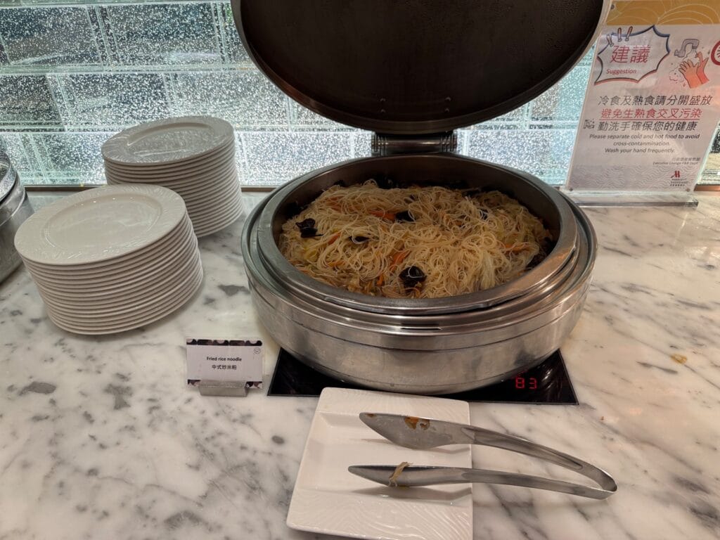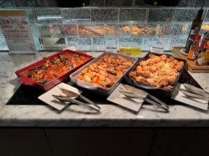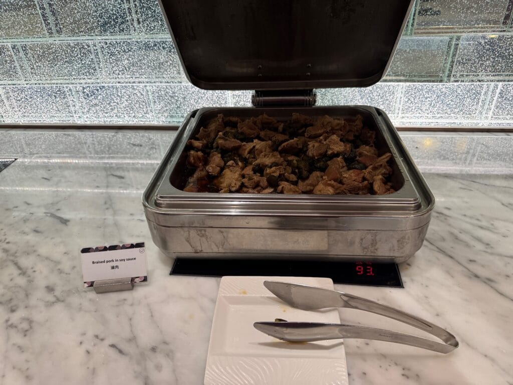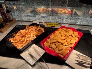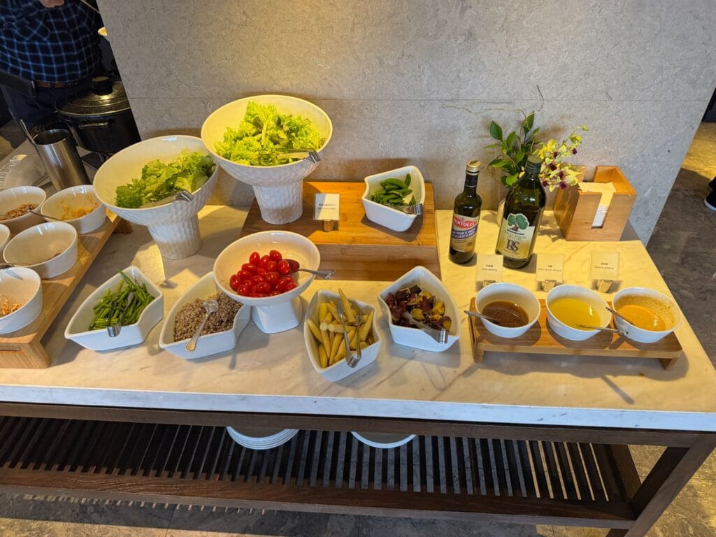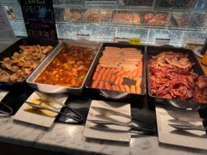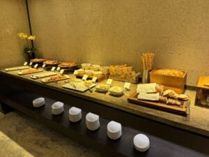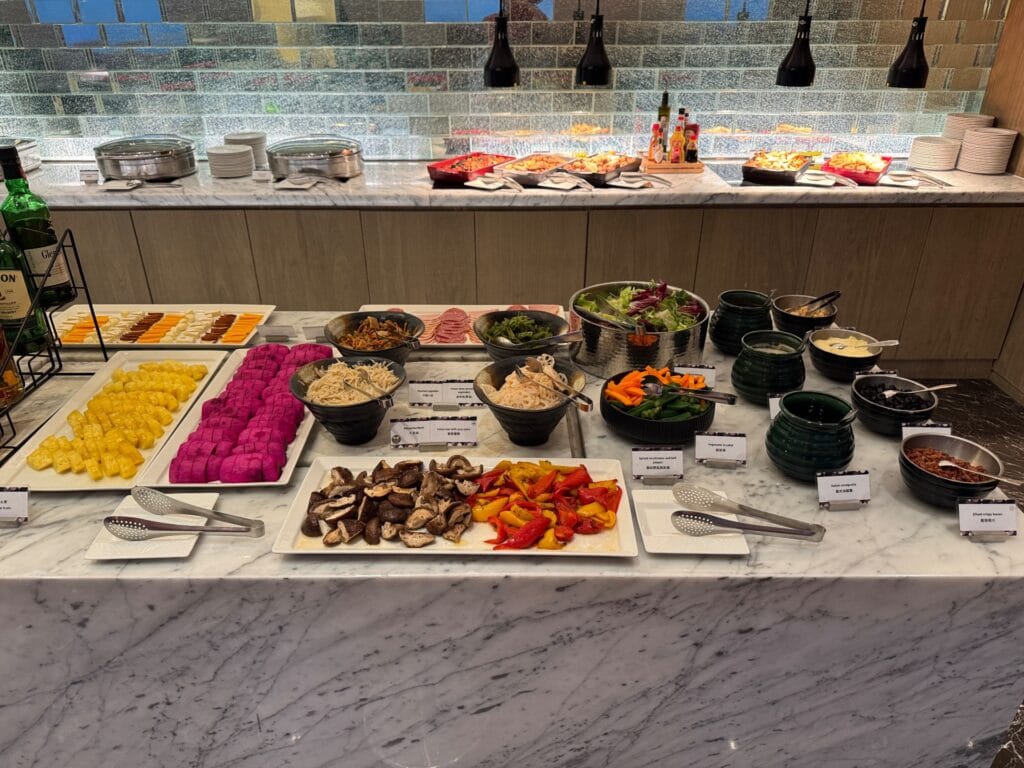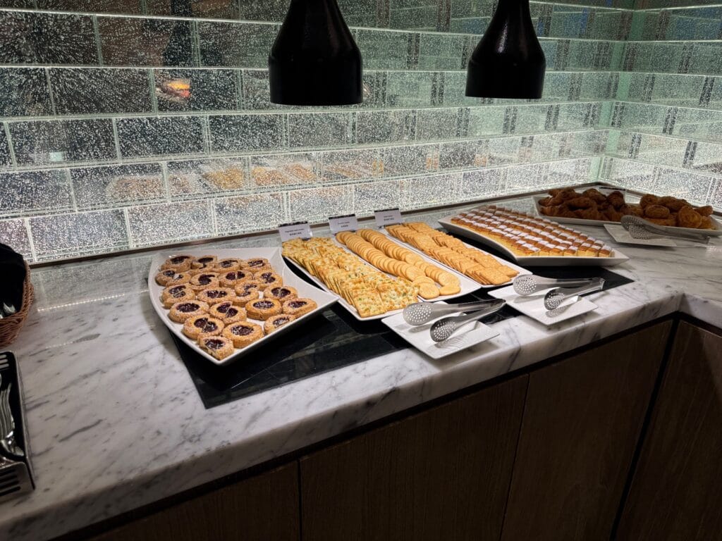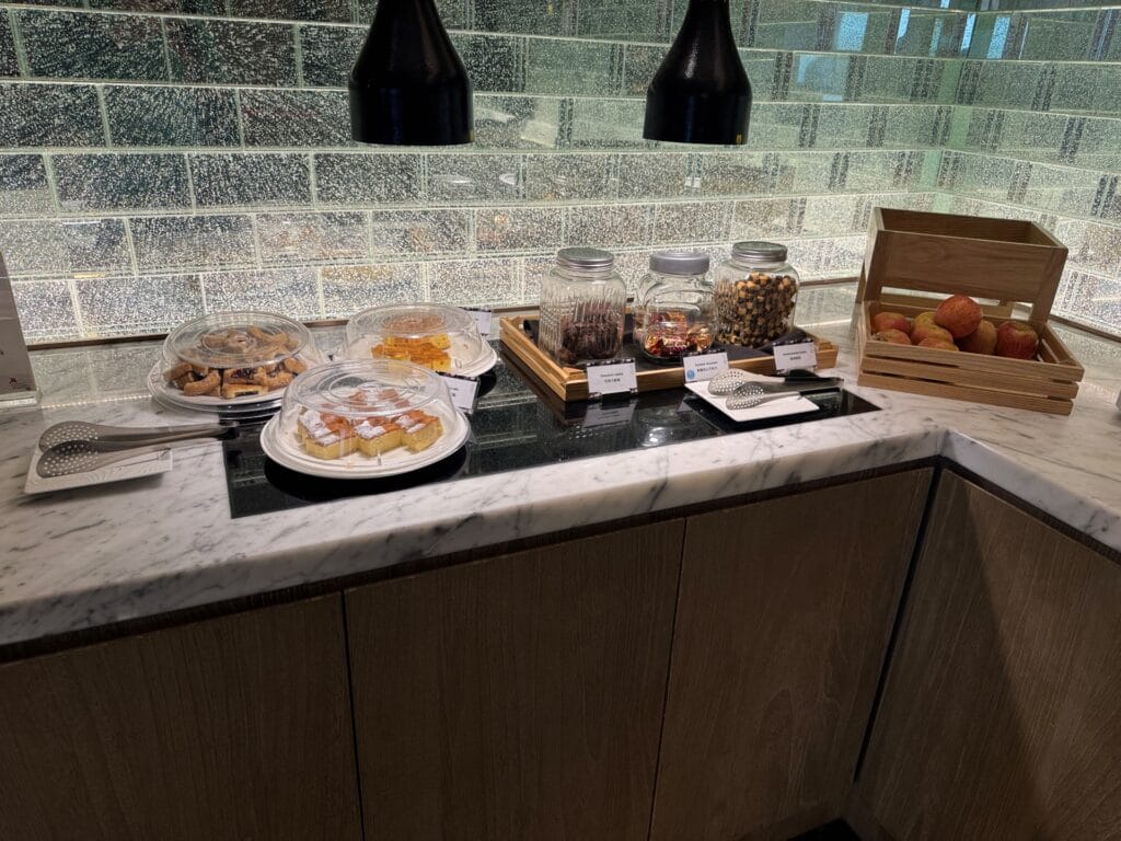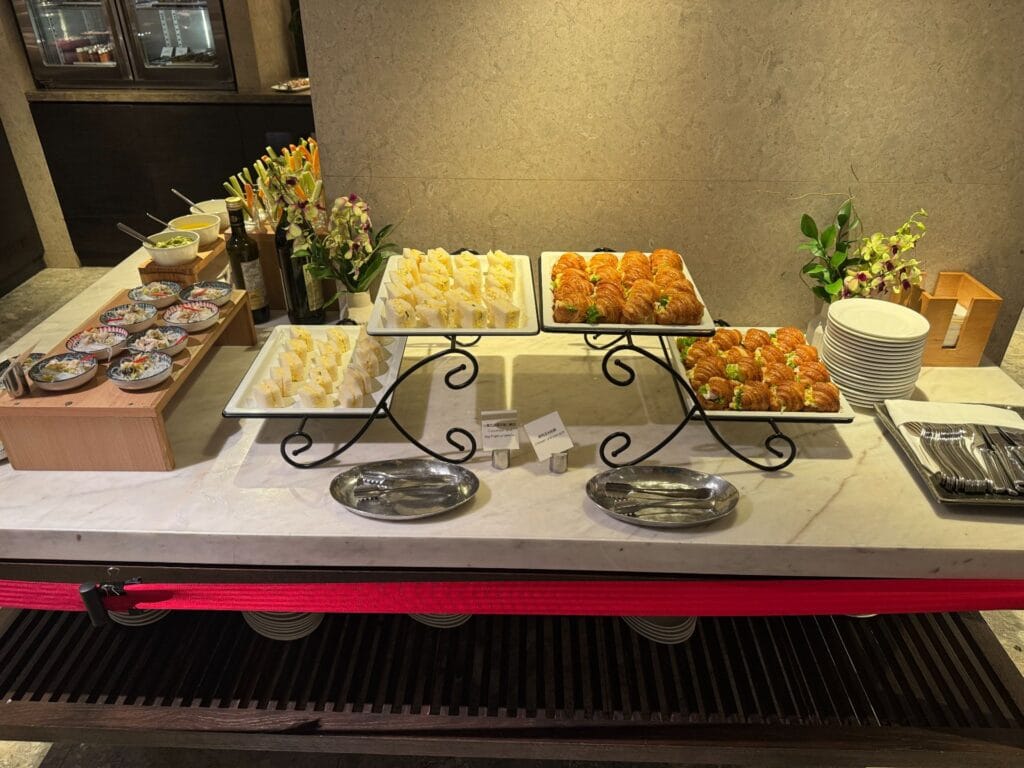 While breakfast ran smoothly, the evening snacks were a crazy affair. Having read other reviews and knowing it would be busy, we got there a little before 5:30pm each night to make sure we got a table. While the food itself is decent (nothing truly outstanding) and more than enough variety for a dinner, the staff have difficulty keeping the stations filled due to how busy the lounge is. For the alcohol (beer, wine, and liquor available), the hostess would serve you which could cause a bit of a queue waiting to get drinks.