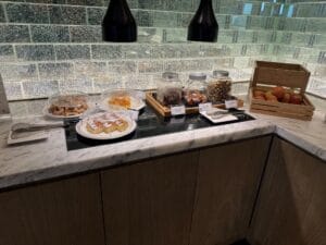 The hotel and lounge were very pleasant and accommodating. The lounge was just off the hotel restaurant and offers a nice quiet place to sit, have a snack and relax. Snacks were potato chips, pretzels, and some a la carte candies. In lieu of breakfast in the lounge, the hotel offered complimentary access to the buffet breakfast that had a nice variety of offerings. Great staff at the breakfast but none in the lounge.